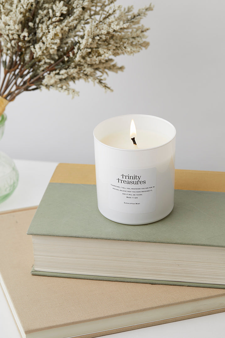 This candle features the powerful scripture Mark 11:24: "Therefore I tell you, whatever you ask for in prayer, believe that you have received it, and it will be yours." Let these words inspire your faith as you enjoy the peaceful ambiance.