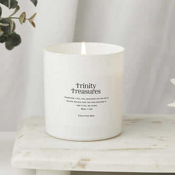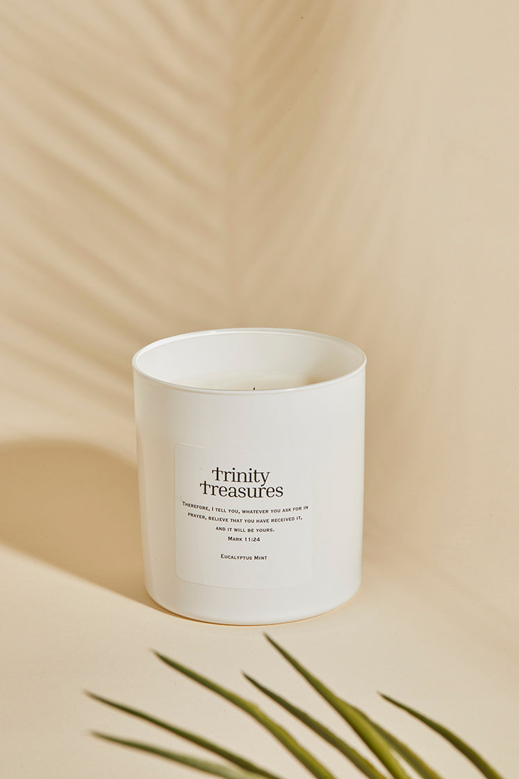 Description: Experience peace and rejuvenation with our 12 oz Eucalyptus Mint Candle from the Trinity Treasures collection. Hand-poured with love, this candle is crafted from premium, all-natural soy wax, ensuring a clean and long-lasting burn. Infused with the refreshing and calming scents of eucalyptus and mint, it creates a serene atmosphere that fills your space with tranquility.